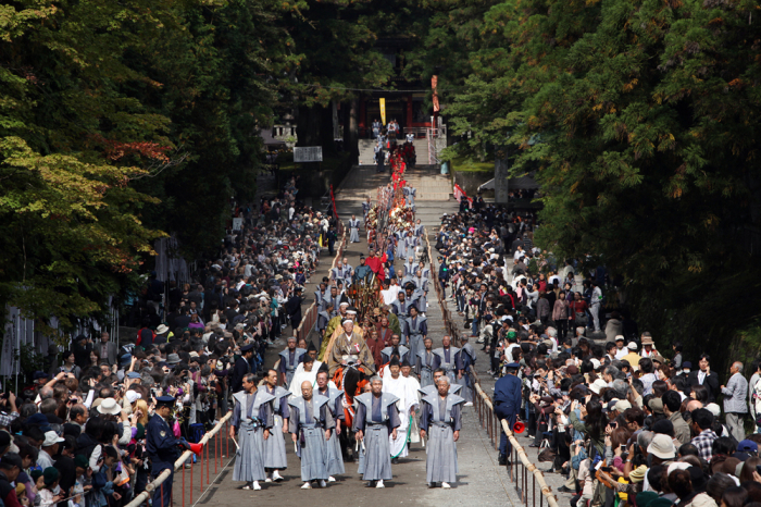 日光東照宮の秋の大祭は臨時祭で、春の例大祭より規模は小さいものの、徳川家康公の神霊を駿府久能山から日光へ改葬した当時の行列を再現した「百物揃千人武者行列(ひゃくものぞろえせんにんむしゃぎょうれつ)」と呼ばれる豪壮な「渡御祭(とぎょさい)」が毎年10月17日に催されます。