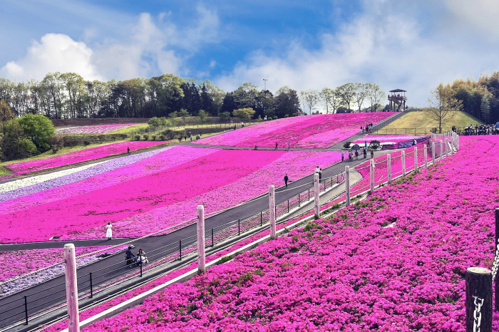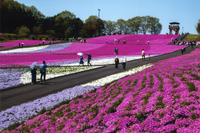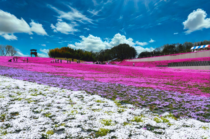 丘の上から見渡すパッチワークのような光景は圧巻!芝ざくらの植栽面積は関東有数の面積を誇ります。