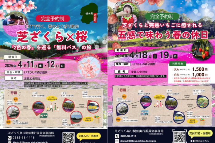 | 開催日時 | 開催期間 | 【第1弾】 芝ざくら×桜「2色の春」を巡る無料バスの旅 2026年4月11日(土)・12日(日) 【内容】 芝ざくら+桜が楽しめる旅 【料金】 無料 ※芝ざくら公園への入園料は別途かかります 【申込締切】4月3日(金) ーーーーーーーーーーーーーーーーーーーーーーーーーーーーーーーーーーーーーーーーーーーーーーーーーーー 【第2弾】いちご狩り付バスの旅 2026年4月18日(土)・19日(日) 【内容】 芝ざくら+いちご狩り付きバスの旅(50分食べ放題) 【料金】 大人(中学生以上)1,500円 / 小人(小学生以下)1,000円 ※芝ざくら公園への入園料は別途かかります 【申込締切】4月10日(金) |