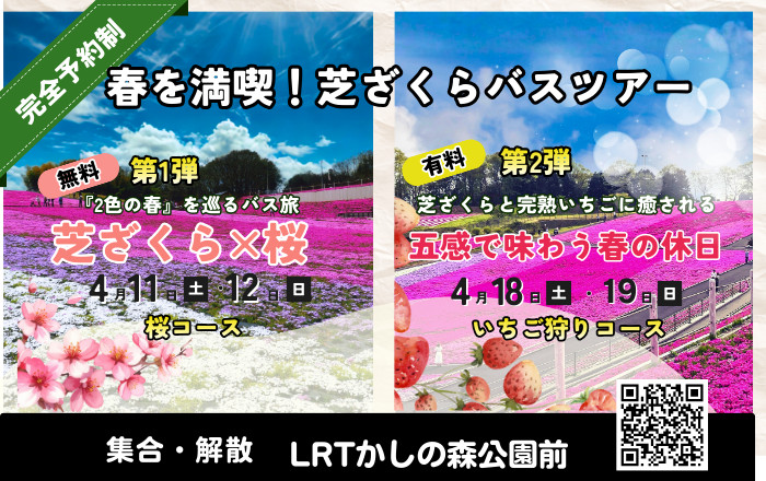 そこで、芝ざくらの開花のピーク予想である4月中旬の土日(4/11・12・18・19)に、特別企画として『バスツアー第1弾・第2弾』(集合・解散LRTかしの森公園前)からの送迎バスを運行いたします。
