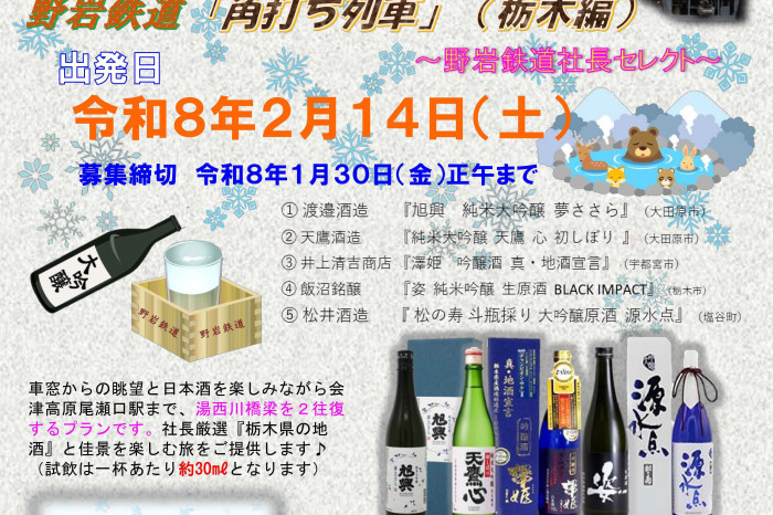 『地酒と絶景を電車で楽しむ 野岩鉄道 角打ち列車』のご案内です。