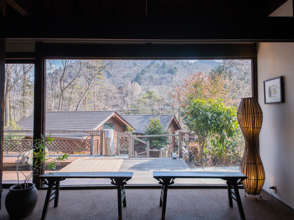 屋根を四方にふきおろしたあずまや風の門をくぐると、空気が一変してそこはもう自然あふれる森のなか。ゆっくり進んでいくと母屋が見えてきます。受付を済ませて、ずらりと並ぶバンガローのような小屋のひとつ「川の湯処」へ。部屋のなかは畳のリビングになっていて寛げる雰囲気です。