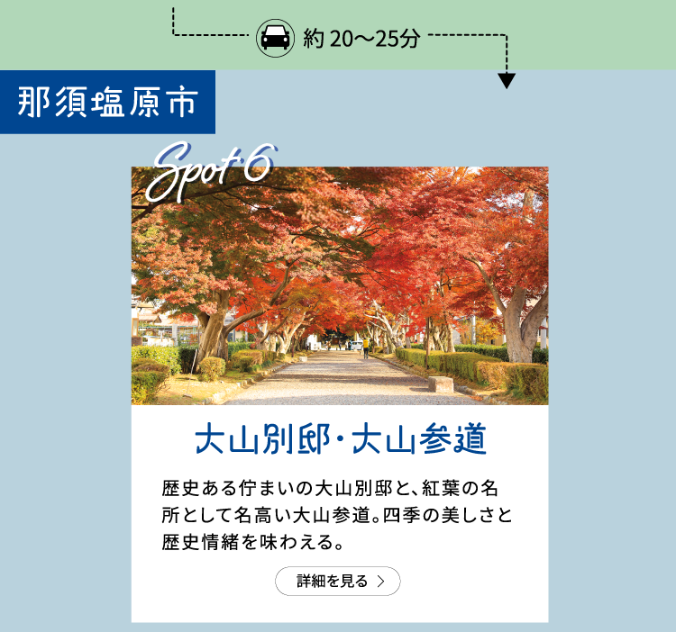 明治の元勲大山巌が大山農場内に建てた、和館と洋館からなる二つの別邸。現在は大山記念館として県有形文化財に指定され、洋館では当時の調度品や資料を展示しています。日本遺産「明治貴族が描いた未来」の構成文化財で、見学は管理する高校への事前連絡が必要です。