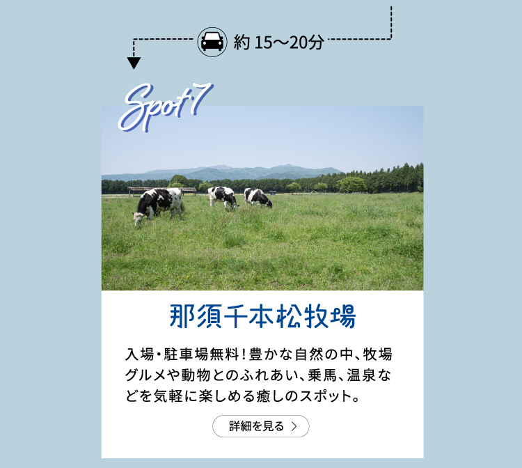 東京ドーム約176個分の広大な敷地に、約500頭の乳牛がのびのび育つ循環型酪農を実践する牧場 。明治の元勲・松方正義が開いた歴史ある農場で、日本遺産「明治貴族が描いた未来」の構成文化財。動物とのふれあいや乗馬、 新鮮な牛乳や自家製ソフトクリームなど、自然の中でゆったり楽しめます。