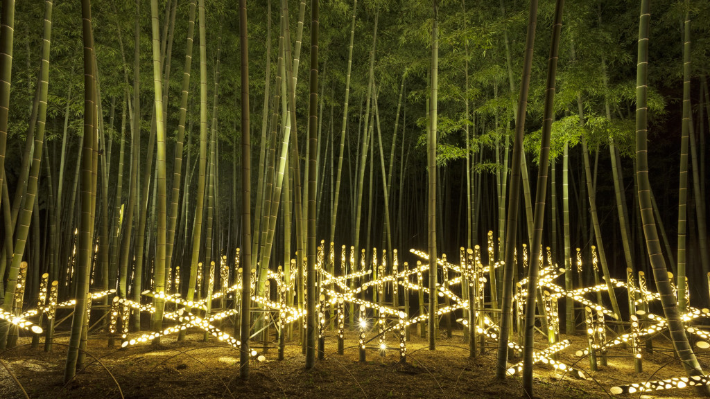 「光が愛でる、美しき竹夜の世界」をテーマとした、竹が寒色や暖色を纏い染まる演出は、息を呑む荘厳な光景です。