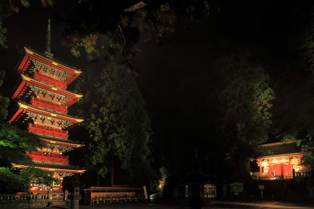 日光東照宮表門・五重塔、日光山輪王寺大猷院(たいゆういん)表門、日光二荒山神社本社拝殿・神橋・楼門などに照明がつけられると、世界遺産の建造物が夜更けに浮かび上がり、静寂の中に昼間とは違った幻想的な世界を演出します。
