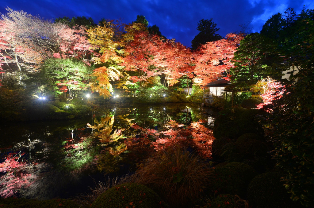 逍遥園は江戸時代に作られた代表的な日本庭園で、池を中心に周囲を歩きながら楽しめる池泉回遊式の庭園であり、日光国立公園の特別保護区の中にあります。そのため環境にやさしいLEDライトを多用し、自然の動植物の生態系に配慮しています。他のライトアップとは一味違う淡い光の演出が、鮮やかに色づいた10種類以上のカエデを浮かび上がらせ、秋の夜を彩ります。