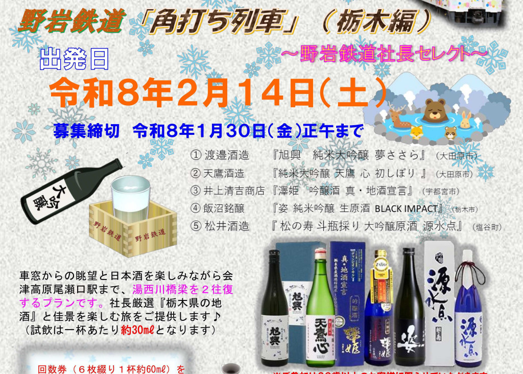 『地酒と絶景を電車で楽しむ 野岩鉄道 角打ち列車』の御案内です。