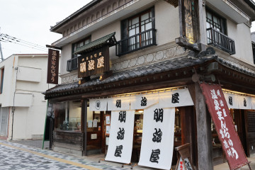 名物の「明治屋の温泉まんじゅう」を製造販売している、明治元年創業の老舗和菓子店です。
