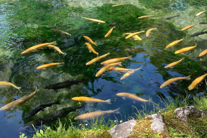園内では、中禅寺湖にしかいないレイクトラウトを始め,様々な種類のさけ・ますの仲間やチョウザメなどが観察でき,さかなたちに餌をやることもできます。