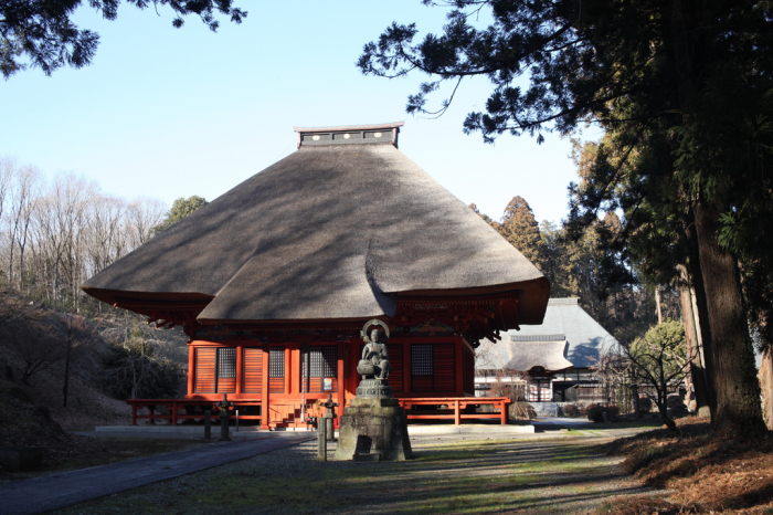 鹿沼市南部の山間にあり、茅葺きの豪壮な本堂などの堂宇が立ち並ぶ様は圧巻です。寛永年間に伽藍全体が焼失し、建物を信徒の努力で再建されたもので、特に唐門は日光東照宮陽明門の手法を取り入れた繊細な彫刻が施されています。
