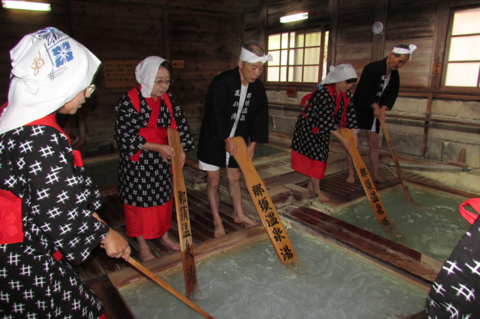ウォーキングの後は、西暦630年に発見された那須温泉「鹿の湯」で湯もみを体験します。