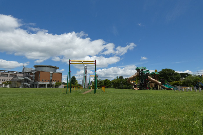 扇形のダイナミックな滑り台が目を引く大型コンビネーション遊具をはじめ、弓形のシーソーやスリル満点のターザンロープなど、全10基ほどのアトラクションが勢ぞろい!