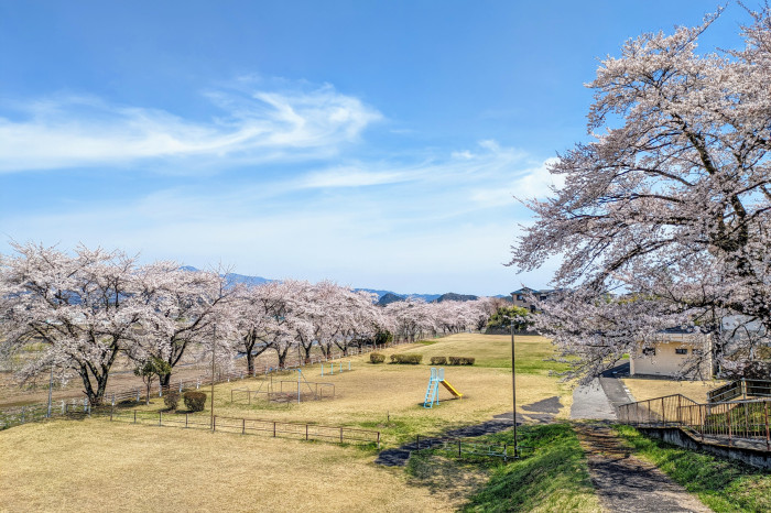 広々とした芝生公園と桜並木が特徴の憩いの広場