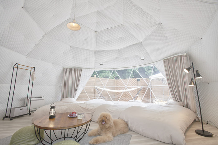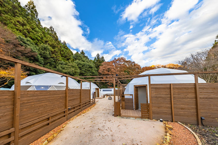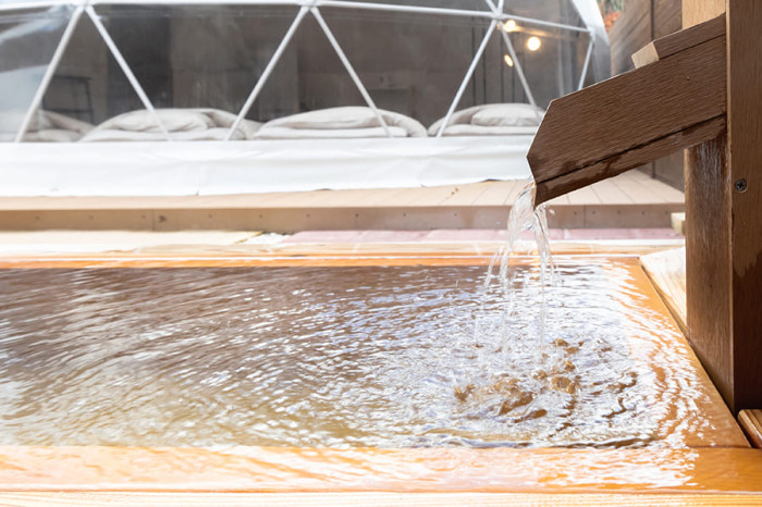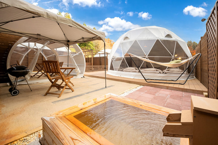 全室に専用露天風呂を完備し、源泉かけ流しの天然温泉を滞在中いつでも好きな時にお楽しみいただけます。グランピングエリアは完全プライベート空間のため、周囲を気にせずゆったりとお過しいただけます。