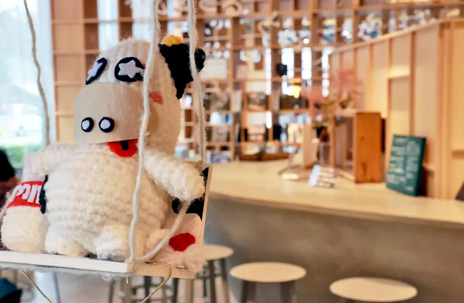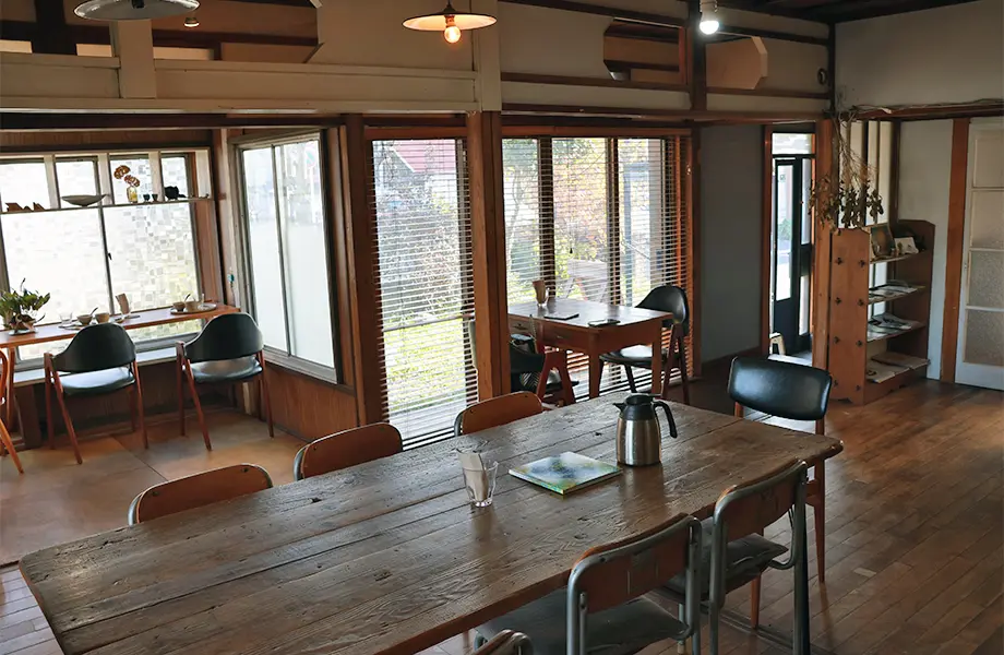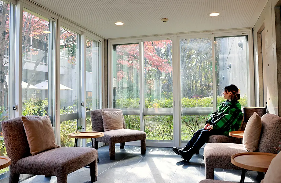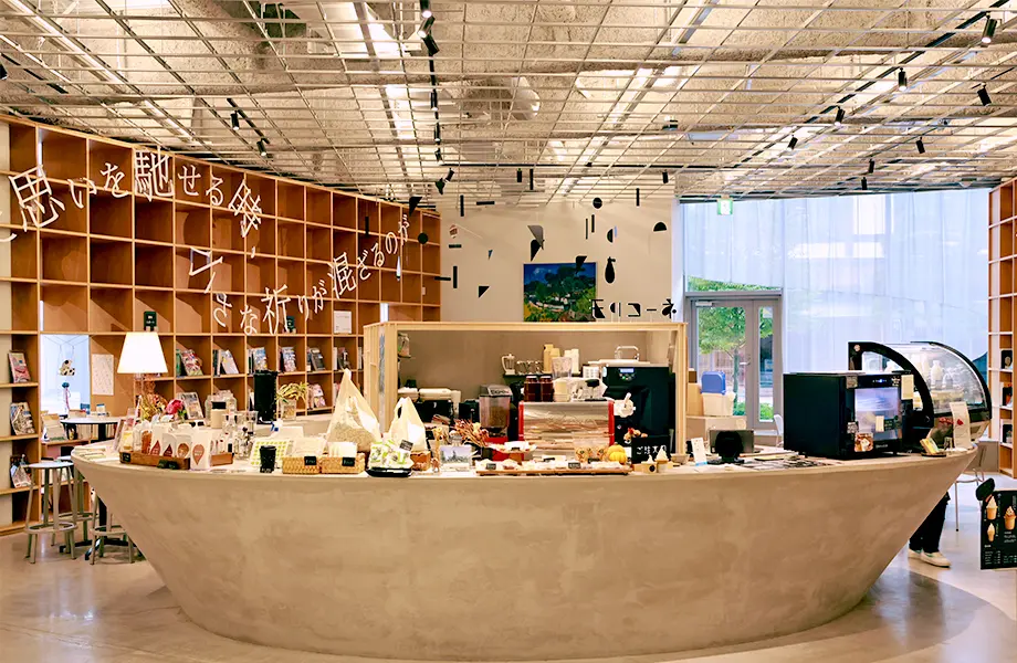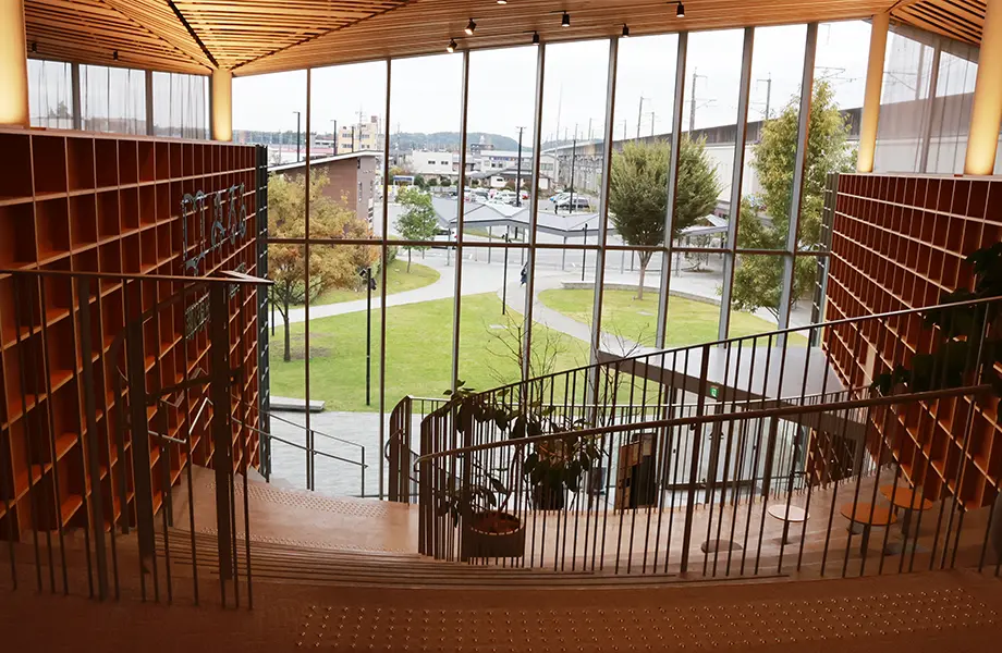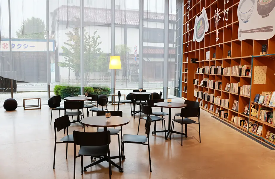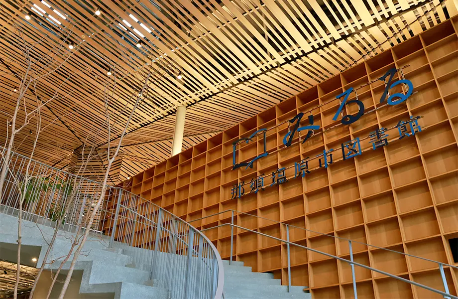 旅の始まりは、駅前の図書館「みるる」。那須塩原市出身の建築家・伊藤麻理氏の設計で、館内に点在する言葉の彫刻や木の格子が美しいファサードなど、公共施設とは思えないほどデザイン性にあふれています。天井まで伸びる本棚や開放的な吹き抜けの空間の中、本やユニークなコピーを追いかけていると、まるで“知の森”に迷い込んだような気持ちに。併設の小さなカフェ「モリコーネ」でコーヒーを味わいながら、これから始まる旅に思いを馳せてみて。