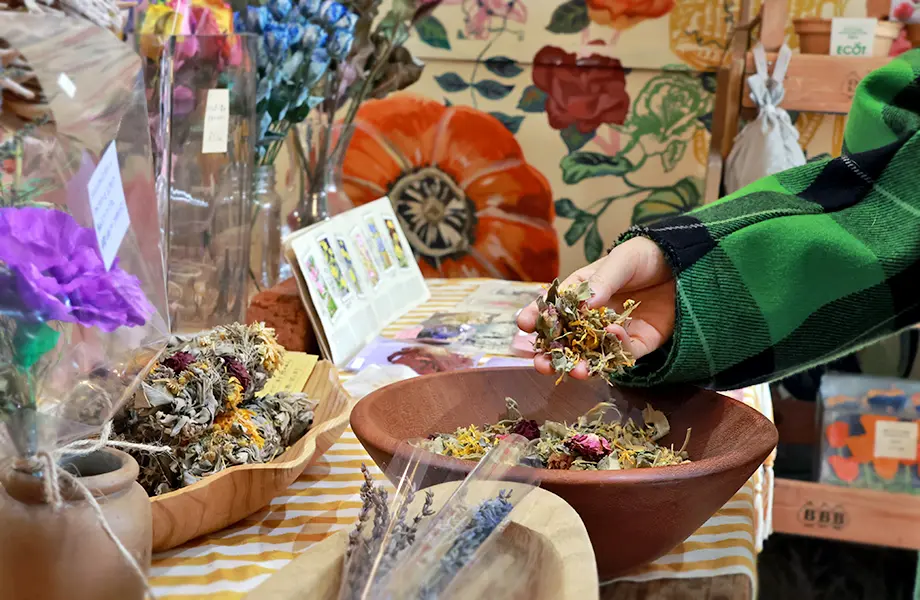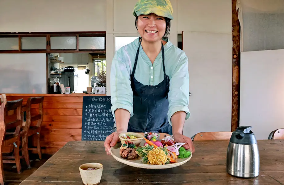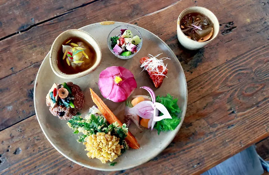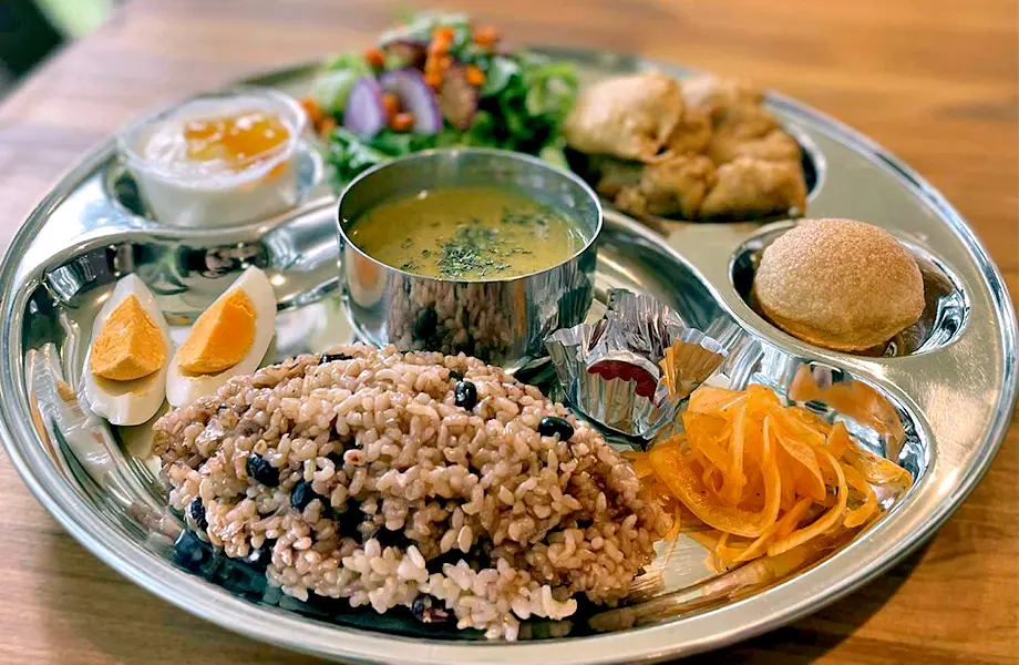 通称SHOZOストリートにある薬膳カフェでランチ。こちらでは、中医学をベースに薬膳を学んだ店主がつくる、薬膳プレートがいただけます。薬膳の理にかなった組み合わせは、デザインとしても美しく、食べることまでを含めて、ひとつのアートのよう。また、金継ぎや陶芸、占星術など感性を磨くワークショップも定期的に開かれ、感度の高い人たちが集う場所でもあります。「食べること」を通じて、日々をていねいにデザインする喜びを教えてくれます。