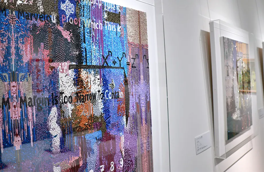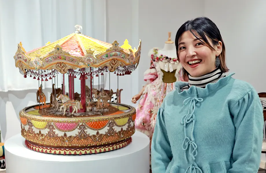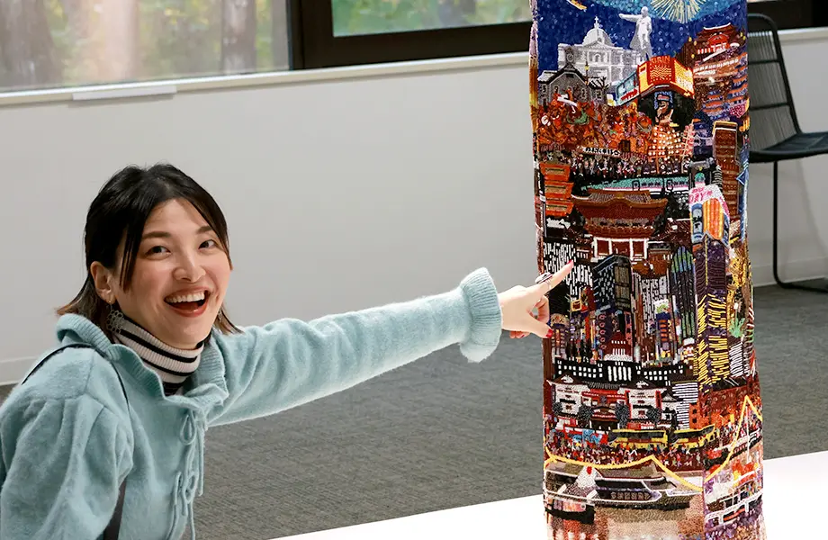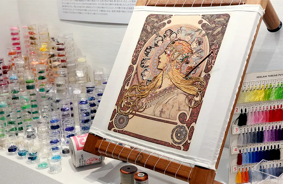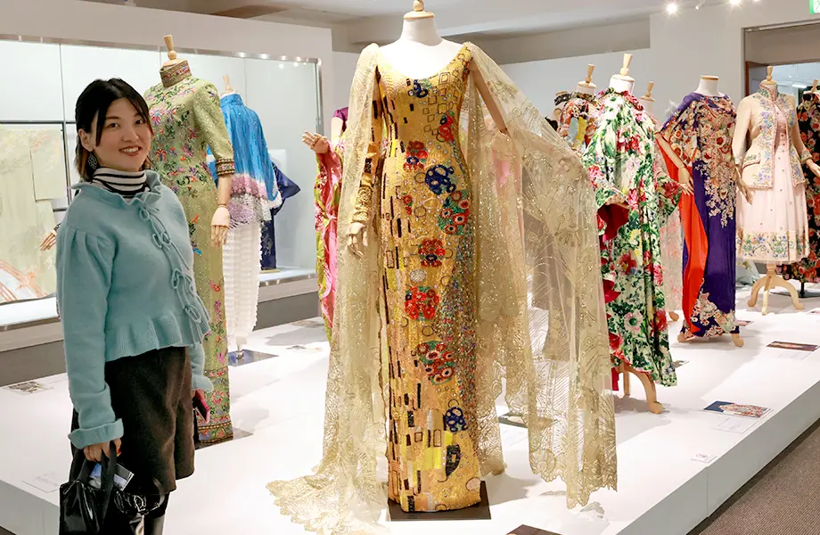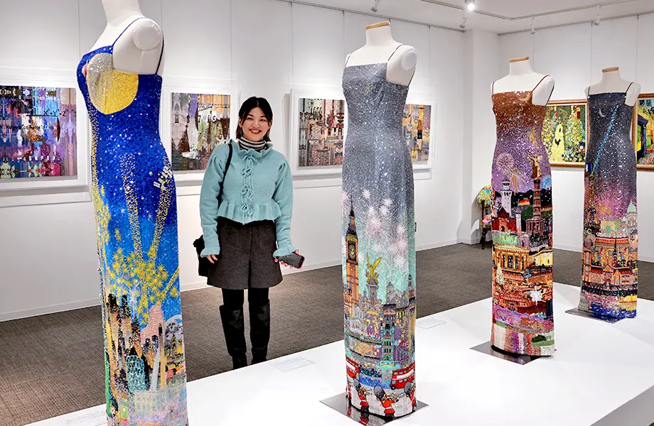 ミュシャの作品をビーズで表現しているものがあって、思わず見入ってしまいました。若い頃、絵の練習でよくミュシャを模写していたので、運命のようなご縁を感じました。そして、世界の夜景をモチーフにしたドレスの中に「日本2020」を発見。その中に東照宮が描かれていて、ここで出会えるなんて…ちょっと感動でした。