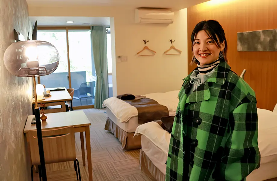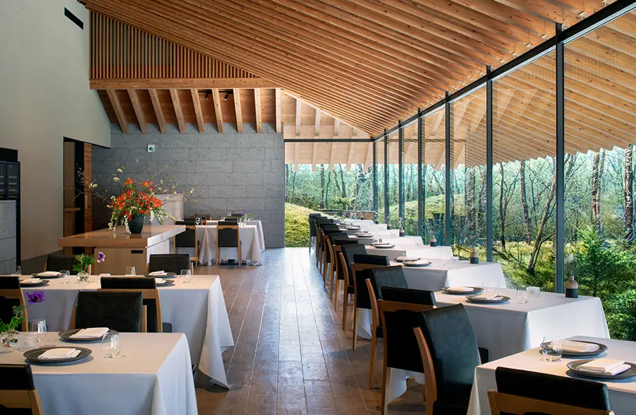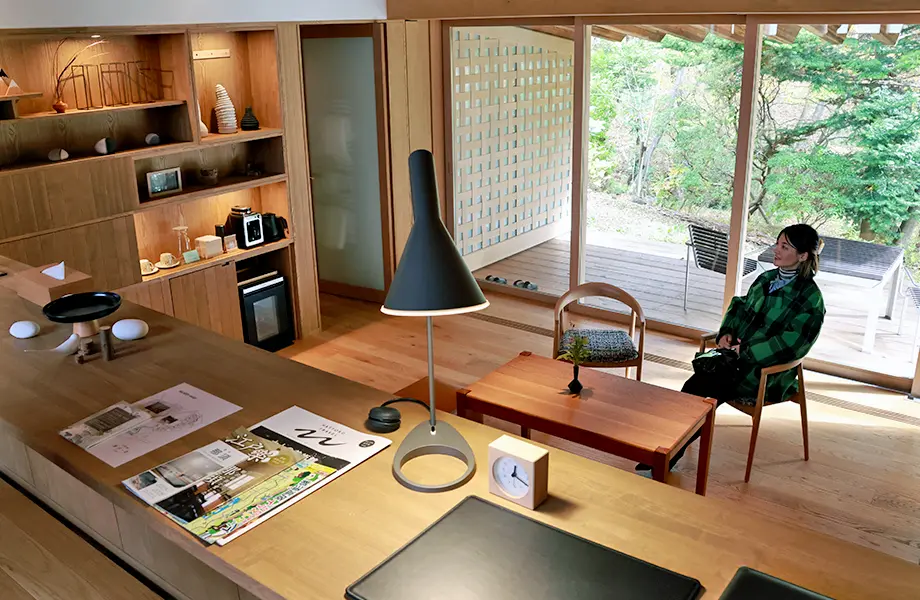 夕暮れとともに向かうのは、森の中の宿「那須無垢の音」。ここには、建築家・石上純也氏が設計した『水庭』があります。人の手でつくられながらも、土地の傾斜によって自然と循環している小さな池たち。人工と自然のあわいが美しいリズムとなって、静かに息づいているようです。かつてアーティストの滞在制作に使われていたB&Bの客室は、美しい余白を感じる心地よい空間。冬の森の静けさの中で、ひらめきが形を結ぶような、特別な時間が流れます。