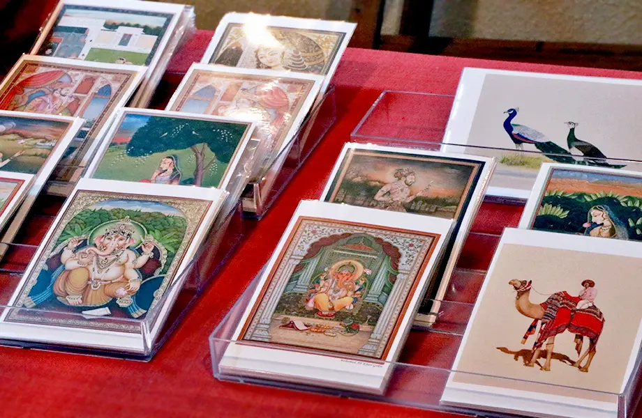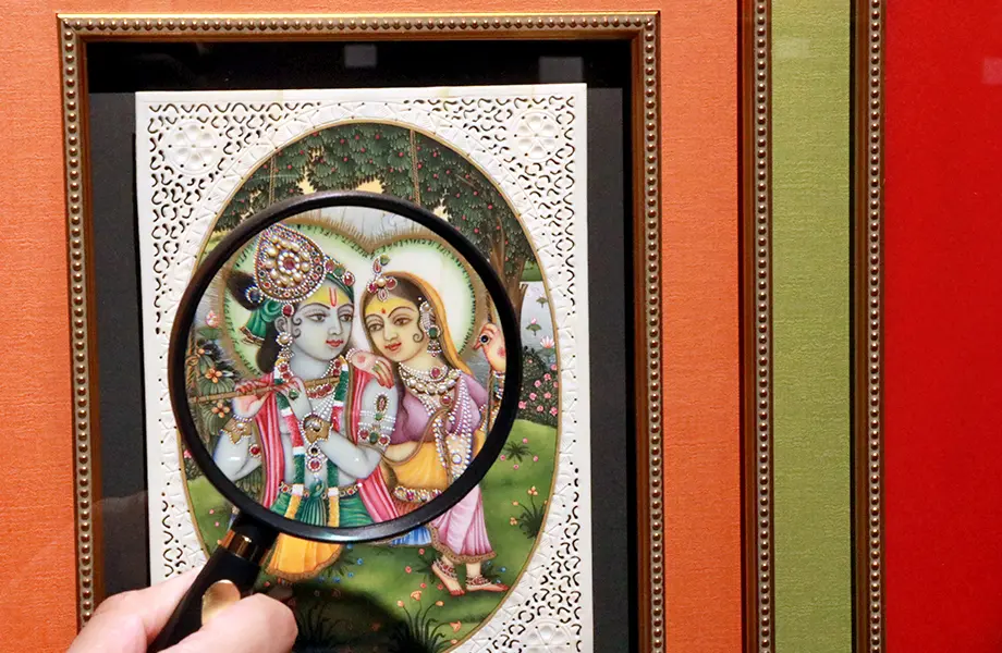 2日目は再びアートから。インド細密画家のモハメッド・アリ・カーン・ゴーリ氏の美術館へ。インド細密画とは、16世紀から19世紀にかけてムガール帝国の宮廷やインド中部から西北部で描かれた伝統的な宮廷絵画です。ルーペを片手にのぞくその世界は、リスの毛で描かれた線の宇宙。じっくり見入っているうちに、微細な世界へと没入していきます。天然石の顔料が光を受けてきらめき、額装の重なりまでがひとつのアート。デザインの本質とは何かを、問わずにはいられないひとときです。