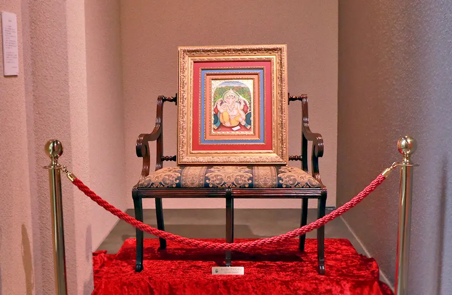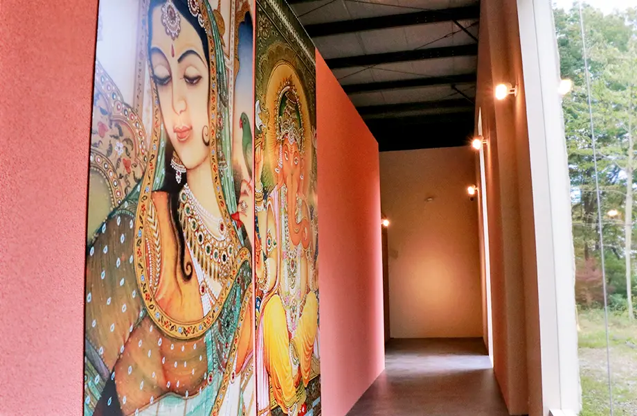 ピンクの展示室の壁は、モハメッド・アリ氏の故郷“ジャイプールの街”をイメージしているそう。