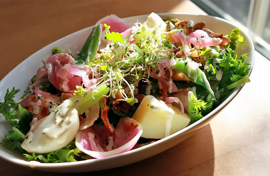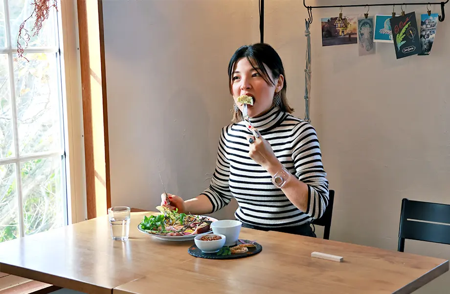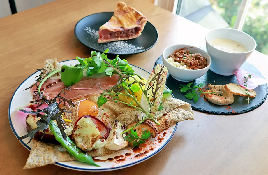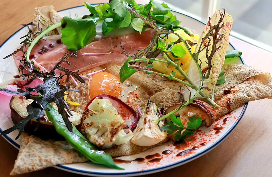 アートの余韻とともに向かうのは、フランスとアメリカのエッセンスを融合させた人気レストラン。スパイスの香りを軽やかに漂わせ、まるで一枚の絵のようなガレットが運ばれてきました。「料理は感性と感覚でつくるもの」と語るシェフ。野菜の表情を見て、その日のインスピレーションで盛りつけているそう。まさに料理とはアートそのもの。日常に少しスパイスを──そんな言葉がぴったりの、心を解き放つランチタイムでした。