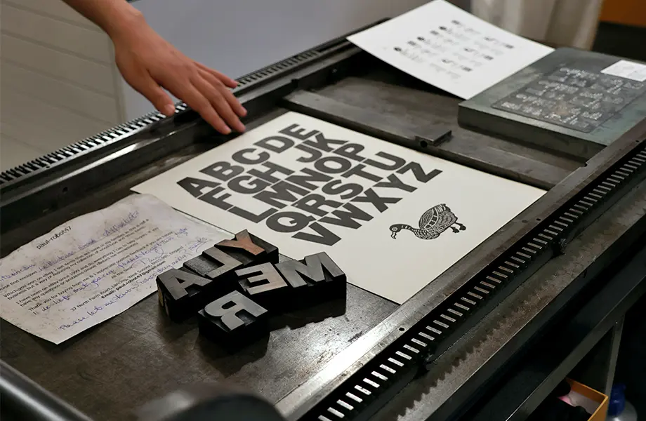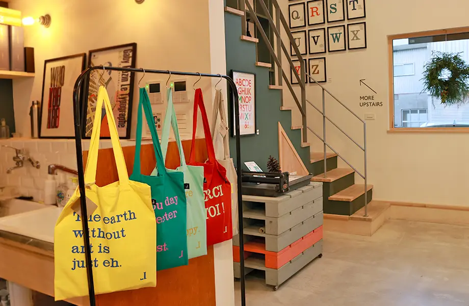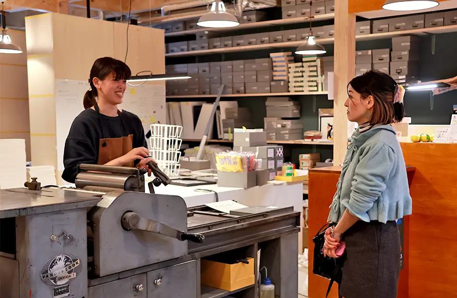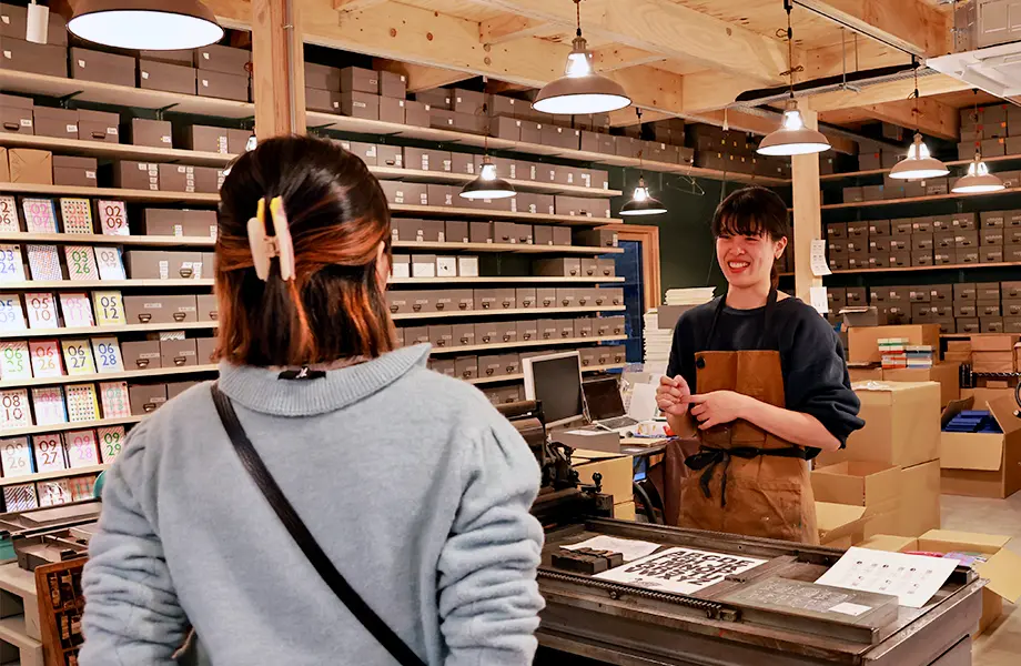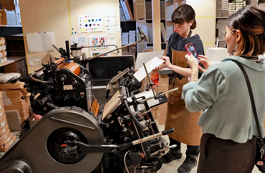 午後は、紙とインクの香りをたどって、活版印刷のスタジオへ。海外から集められた印刷機が並び、職人の手で一枚ずつ刷られていく活版印刷。木製活字など、今では貴重な道具たちが息づく工房です。わずかな“かすれ”や“ズレ”の中に、思いがけない美しさが生まれます。狙わずして生まれるゆらぎこそ、印刷の魅力。デジタル全盛の時代にあって、ここでは人の手のデザインが、とてもあたたかく輝いています。